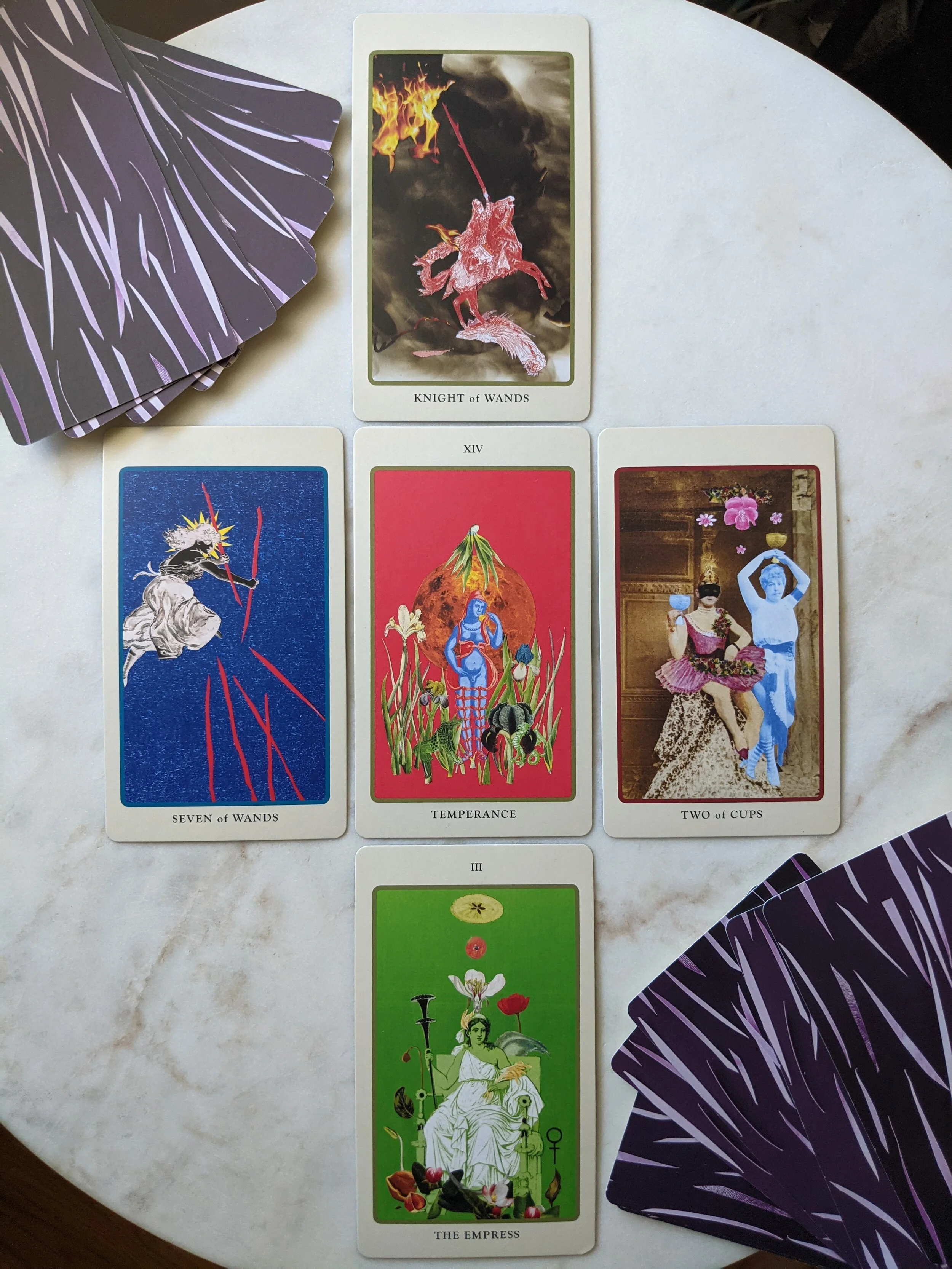 The card on the right represents the project’s manifestation, that is, the work involved in the next steps, and hints about the form it will take upon completion. This is the touch of the project. The Two of Cups is a card about friendship, new relationships, and opening one’s self to the world. This card is in contrast to the fiery energy of the Knight and Seven of Wands-- proof of the transmutational power of Temperance. This may indicate that the project could manifest itself as a salon or small group conversations. The playful costumes of the figures in the card also indicate to me that it could also manifest itself as a poetry reading series or a table read of a short play. I once participated in an art project where I sat with a partner across a table, and I selected a phrase from a book and tried to psychically project it into the mind of my partner, who was then supposed to draw it. That is also Two of Cups energy. The energy here is social, small, and intimate.